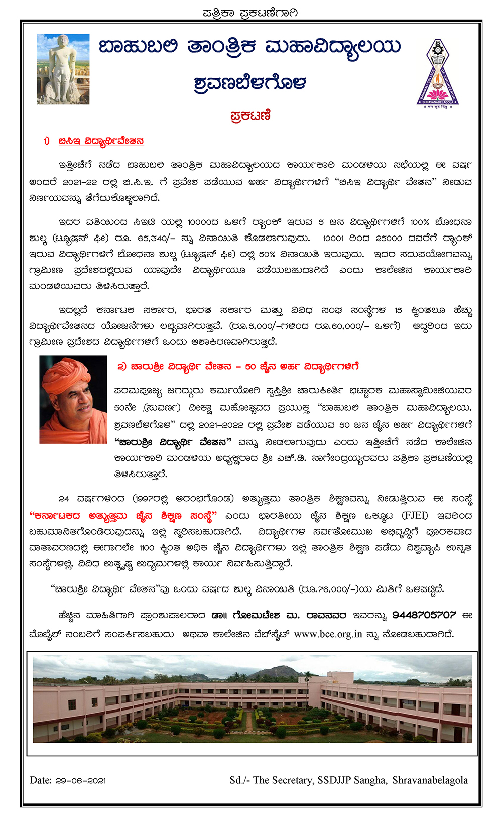 The Institution Bahubali College of Engineering (BCE) was established during 1997 by His Holiness Jagadguru Karmayogi Swasthishree Charukeerti Bhattaraka Swamiji. Presently the Institution is running under the Chairmanship of His Holiness Madhabinava Charukeerti Bhattaraka Swamiji who is heading the S.S.D.J. Jnana Prasaraka Sangha which is running Educational Institutions from Primary education to Graduate and Postgraduate levels in various disciplines / fields of study. The college is situated in Shravanabelagola away from the urban crowd with 26 acres of lush green environment. The College consists of three blocks for teaching-learning process and a separate Boys and Girls Hostels. The College has gained experience and endeavours to produce bright young men and women for the millennium with excellence in technical knowledge. The BCE-Shravanabelagola has been recognized by the Government of Karnataka(GoK) and approved by the All India Council for Technical Education (AICTE) New Delhi and it is affiliated to the Visvesvaraya Technological University (VTU), Belagavi. The institute has been conferred with a Jain Religious Minority Status. It is a self-financed Institution.
